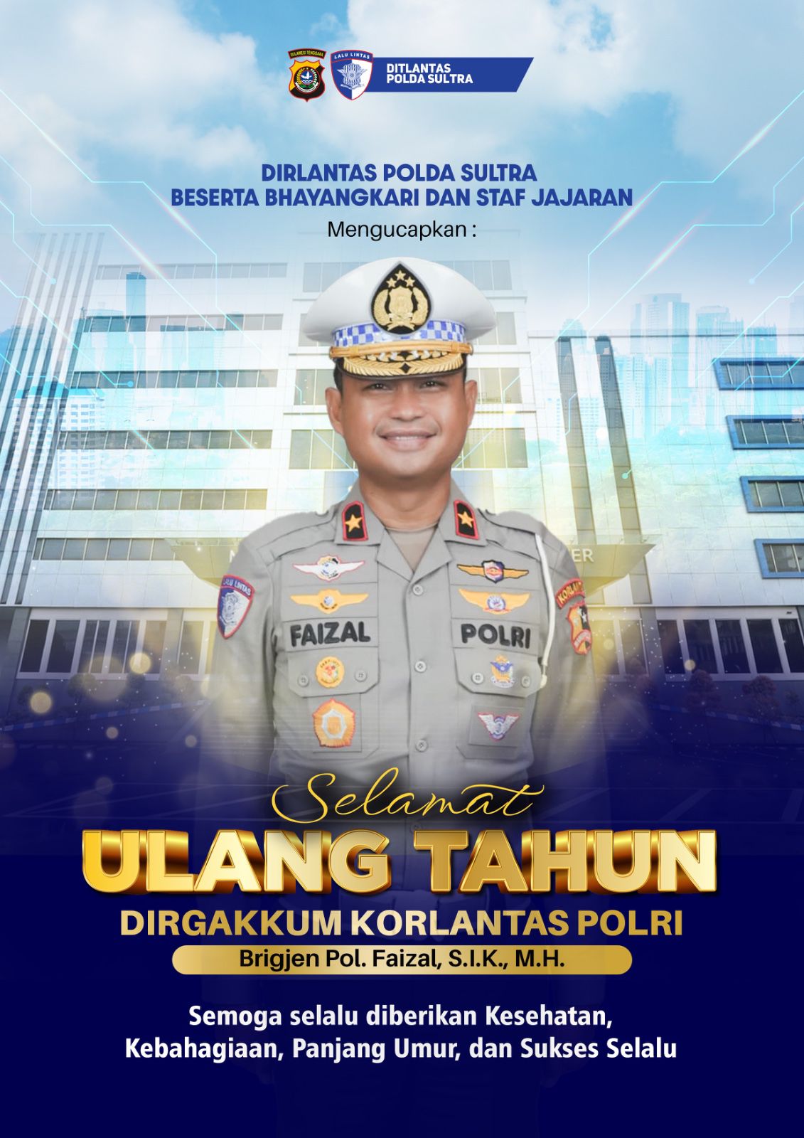 Dirlantas Polda Sultra beserta jajaran dan Bhayangkari mendoakan agar Brigjen Pol Faisal senantiasa diberikan kesehatan, kekuatan, serta kesuksesan dalam mengemban tugas dan tanggung jawab, serta terus menjadi teladan dalam pengabdian kepada bangsa dan negara.
